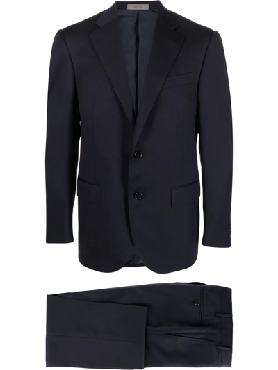 single-breasted virgin-wool suit from CORNELIANI featuring blue, virgin wool, notched lapels, chest welt pocket, button fastening, two side flap pockets, buttoned-cuff sleeves, English rear vents, belt loops, button fly fastening, two side slash pockets, two rear button-fastening jetted pockets, straight leg and unfinished hem.