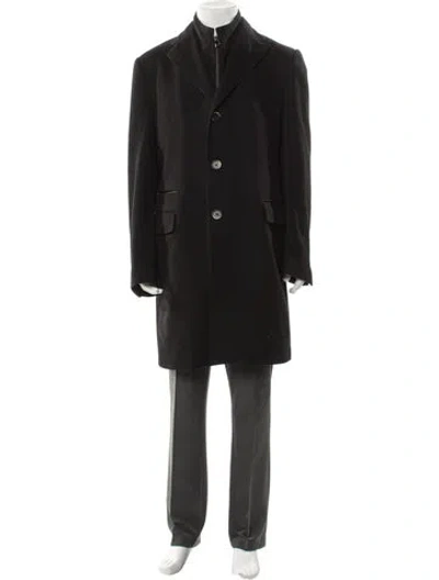 Corneliani Virgin Wool Overcoat Black Logo Lining Collar Flap Pockets Fit: Outerwear by Corneliani typically fit true to size. | Corneliani Virgin Wool Overcoat in Black, Men's M