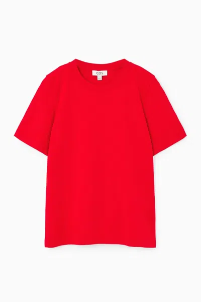 Quality T-shirts have been a cornerstone of the COS collection since day one. An understated essential, this tee is made from cotton with a soft jersey quality and comes in a vibrant bright-blue hue. Cut for a straight, regular fit, it has a tightly ribbed round neck and is finished with neat topstitching at the edges. Regular fit, 150gsm Short sleeves Shell: 100% Cotton. Excluding trims / Machine washable Back length of size S is 64cm / Model wears a size S