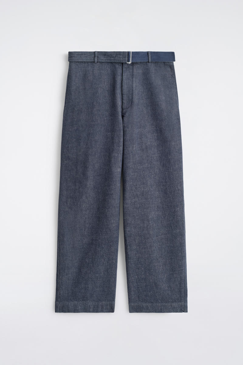 These modern trousers fuse denim and tailoring codes - they can be styled casually or dressed up for the weekend. They're crafted from organic- and recycled cotton in a classic dark-blue wash and designed with a belted waist that tailors the relaxed fit. There's pockets at the side and a welt pocket at the back. Relaxed fit. Hook-and-bar and zip closure. Organic cotton is grown from non-genetically modified seeds without chemical fertilisers or pesticides Shell: 80% Organic cotton, 20% Recycled cotton. Excluding trims / Machine wash Inside leg length of size EU 48 is 75.8cm / Model wears a size EU 48 COS Belted Denim Straight-Leg Trousers in Blue - Men