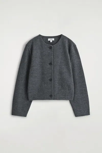This refined cardigan is a modern expression of '90s minimalism. Perfect for layering, it's crafted from a boiled merino wool blend and shaped in a relaxed silhouette with subtle pockets at either side. Style it as a co-ord with the matching skirt. Relaxed fit. Button closure. This product contains Responsible Wool Standard TE-00047206 (RWS) wool fiber from farms certified to animal welfare and land-management requirements Shell: 50% Merino wool, 32% Cotton, 18% Recycled polyester. Excluding trims / Dry clean Back length of size S is 20.94" COS Women's Boiled Merino Wool Cardigan in Dark Grey Cotton Size: Large Women > Womenswear > Knitwear > Cardigans
