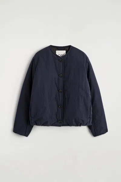 This modern liner jacket lends itself to effortless transitional styling. Lightly padded for warmth, this piece is made from a soft cotton blend and designed with practical pockets and a discreet elasticized hem and cuffs. The classic navy tone works in harmony with a neutral wardrobe. Regular fit. Button closure. Recycled polyamide is polyamide made from textile waste in production Shell: 78% Cotton, 22% Recycled polyamide (Recycled nylon). Lining and padding: 100% Recycled polyester. Excluding trims / Machine wash Back length of size S is 23.58" COS Women's Padded Liner Jacket in Navy Cotton Size: Large Women > Womenswear > Coats & Jackets > Jackets