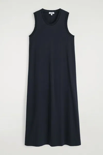 Pour le printemps-été 2025, la robe midi classique explore des formes fluides et se pare de finitions soignées. Cette pièce est confectionnée en jersey de coton doux avec une touche d'élasticité et présente un décolleté arrondi, des poches discrètes et un ourlet évasé. Elle est bordée de volants pour un contraste subtil. Coupe regular Matière: 92 % Coton, 8 % Élasthanne. Côtes: 100 % Coton. Excluant les finitions / Lavable en machine La longueur du dos en taille S est de 127 cm / Le mannequin porte la taille S COS Robe Midi Froncée En Coton in Bleu