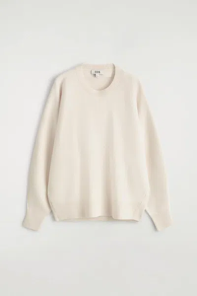 Sculptural in shape, this camel-hued sweater is knitted from an RWS wool blend that's double-faced for a premium hand feel. It's cut in a relaxed silhouette and has ribbed trims and rounded, curved sleeves. Relaxed fit. This product contains Responsible Wool Standard TE-00047206 (RWS) wool fiber from farms certified to animal welfare and land-management requirements Shell: 94% RWS Wool, 5% Polyamide (Nylon), 1% Elastane. Excluding trims / Machine wash Back length of size S is 24.01" COS Women's Rounded Double-Faced Wool Sweater Jumper in White Size: Large Women > Womenswear > Knitwear > Jumpers
