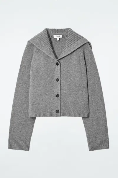 Cut in a boxy shape, this boxy cardigan is knitted from pure RWS wool that's equal parts soft and warm. It's designed with a unique sailor collar that folds over the shoulders and comes in a mélange-grey tone that will style effortlessly with the other pieces in your wardrobe. Regular fit Button closure This product contains Responsible Wool Standard TE-00047206 (RWS) wool fibre from farms certified to animal welfare and land-management requirements Shell: 100% RWS Wool. Excluding trims / Machine wash Length of size S is 51cm / Model wears a size S