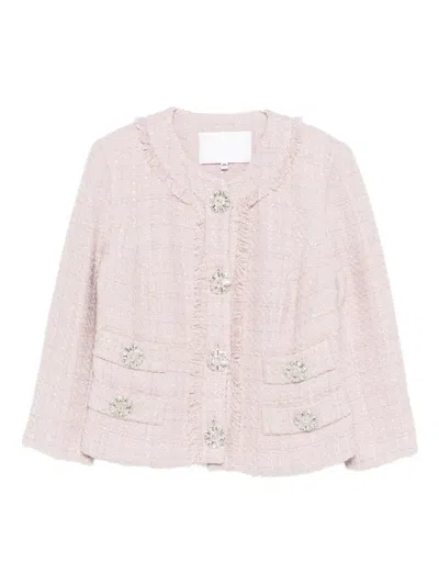 Macie Casual jacket in rose-pink polyester, round neck, long sleeves, frontal buttons closure, crystals detail, tweed fabric, lurex detail, 100% polyester, Made in Greece, Model is 180 cm and wears 36