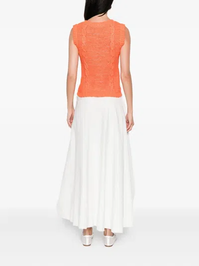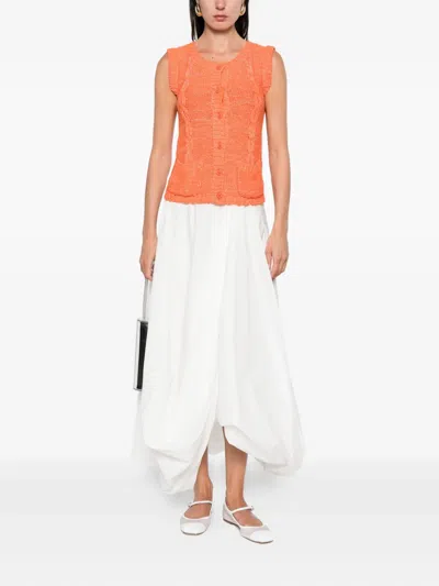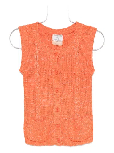 circa 1970s orange cotton blend cable knit pattern sleeveless design button front closure patch pockets Condition: GOOD. This previously owned and used item is in good condition with minimal signs of use. This may include fading of material or plating and scratches.