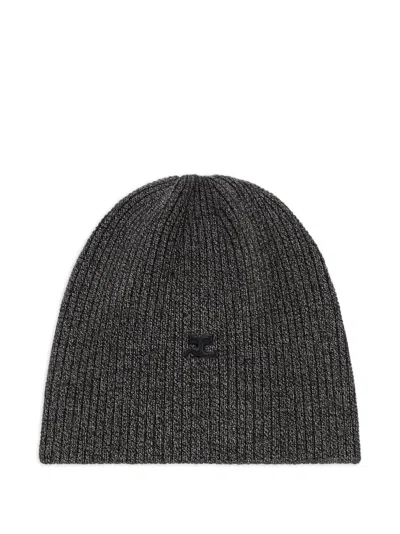 Rib-knit merino wool beanie with an embroidered logo patch at the front.