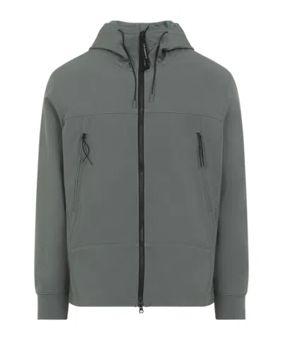 Cp Company Shell-R Goggle Green Polyester Jacket. Crafted from green softshell stretch, it features a hood with the iconic Goggle Lens and drawstring, a front two-way zip fastening with branded textile puller, two zip pockets on the front, long sleeves with ribbed cuffs, and a concealed drawstring at the hem. The jacket is windproof and water-repellent.