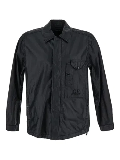 Linen shirt with high collar and hidden zipper with flap closure Flap chest pockets with embroidered logo