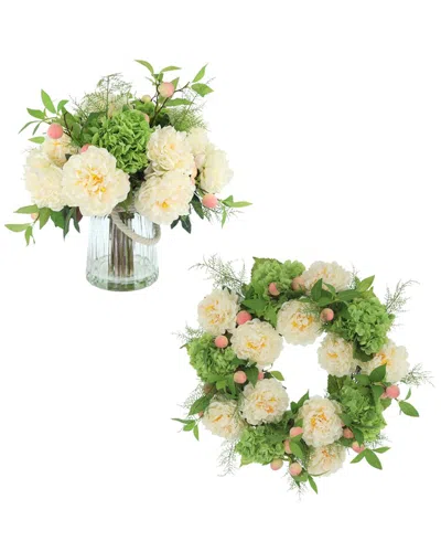 About The Brand: Fine Floral Arrangements For The Perfect Finishing Touch. Color/Finish: Cream; Green Design Details: Bring The Beauty Of Spring To Your Home With The Stunning 23 Faux Floral Wreath And Centerpiece. Featuring Real-Touch Hydrangeas, Lifelike Peonies And Charming Peaches, This Set Is The Perfect Addition To Your Seasonal Décor. Requiring No Maintenance Aside From An Occasional Dusting, You Can Simply Unbox And Place In Your Favorite Spot To Enjoy Worry-Free, Season After Season. Measurements: 28In X 28In X 23, 23In X 23In X 7 Arrives Ready To Hang Polysilk; Glass Wipe Clean With A Dry Cloth Made In The Usa