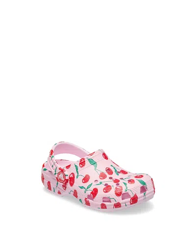 A cherry print sweetens this classic clog scaled-down for kiddos with the same porthole detailing that creates ventilation and room for fun charms. Flip-up heel strap Synthetic upper, lining and sole Imported