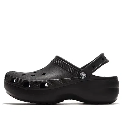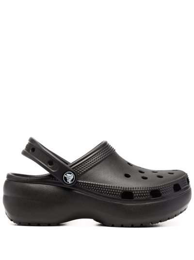 Black Classic Platform Clog slides from CROCS featuring cut-out detailing, slingback strap, round toe and flat sole.