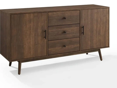 Crosley Furniture Lucas Dining Sideboard Buffet with 2 Cabinet and 3 Drawer Storage for Dining Room, Kitchen, and Living Room, Dark Walnut THROWBACK LOOK - Mid-century sideboard with ample storage and a charming throwback look DURABLE FRAME - Wooden frame supported by angled tapered legs; Material - Wood; Color - Dark Walnut; Dimensions (W x D x H) - 58 x 15.75 x 30 inches; Weight - 95.7 pounds 2 CABINETS - 2 cabinets each feature an adjustable/removable shelf 3 DRAWERS - 3 deep storage drawers with roller glides; Drawers and removable shelves have a weight limit of 15 pounds; Sideboard weight limit is 100 pounds STRIKING FINISH - Dark walnut brown finish accents with matte black metal hardware Expand the storage space in your living room or dining room with the Crosley Furniture Lucas 2 Cabinet 3 Drawer Dining Sideboard Buffet. This handsome dining room sideboard boasts a chic mid-century look with a boxy top and round, angled tapered legs. Its wood frame features a dark walnut brown finish that neatly complements your rustic or modern farmhouse sense of style. The kitchen buffet features 3 wide drawers, each with smooth metal glides, perfect for silverware, serving tools, and kitchen hand tools. 2 side cabinets provide space for larger items with removable, adjustable shelves to help customize the usable space as needed for countertop appliance storage or even your vintage vinyl collection. Metal knobs and handles, each with a matte black finish, neatly complement the walnut surface. Give your living room, bedroom, or dining room some playful throwback-style storage space with the Crosley Furniture Lucas 2 Cabinet 3 Drawer Dining Sideboard Buffet.