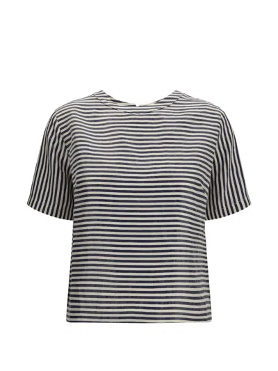 The short-sleeved T-shirt by Cruna is a modern and refined piece, crafted from a slightly shimmering fabric that adds brightness to the look. The design features a shorter length, a classic crew neck, and short sleeves for a fresh and versatile style. The button detail on the back, creating a subtle opening, adds an original and feminine touch. Perfect for casual-chic outfits with a distinctive character. size: 32, 34, 36, 38, 40, 42, 44, 46, 48, 50, 52, 54, 56, 58, 60, 62, 64, 66