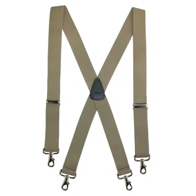These solid suspenders are great to use for an everyday accessory. The swivel hook ends easily attach to the belt loops on your pants and the adjusters slide to a comfortable fit. Made of Elastic 1.5 inches wide Adjusts from 33-49 inches long X-back style with leather back patch; silver metal adjusters and swivel hook clip-ends Stamped with CTM logo Made in the U.S.A.