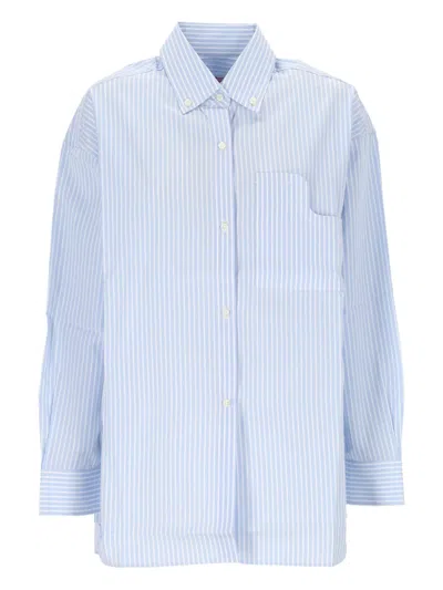 blue and white vertical stripe pattern button fastening chest patch pocket classic collar long sleeves
