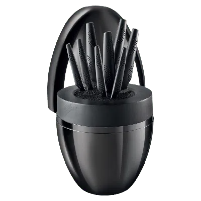 The Cuisine::pro® iD3® BLACK SAMURAI The EGG is a 9-Piece Knife Block. This stunning block set features a unique and trademarked egg silhouette and is crafted from the finest quality stainless steel. With its chic mirror finish and acacia wood rim, this block will be a standout item in your kitchen. The Cuisine::pro® iD3® BLACK SAMURAI™ THE EGG 9-Piece Knife Block contains 1 x 20cm/8" Chefs Knife, 1 x 20cm/8" Bread Knife, 1 x 20cm/8" Carving Knife, 1 x 15cm/6" Santoku Knife, 1 x 11cm/4" Utility Knife, 1 x 12.5cm/5" Santoku Knife, 1x 10cm/4" Serrated Utility Knife and 1 x 9cm/3.5" Paring Knife. Premium Japanese Steel: Fully forged, Japanese Stainless Steel 420J2 Precision Tapering: Double-bevel, twice-sharpened blade is tapered to a 15-20 degree angle Innovative Design: Damascus-inspired blade features antimicrobial, matte black ceramic coating and our exclusive MicroDot® Technology which assists with food release Engineered for Performance: Ice-hardened and tempered to 53 HRC on the Rockwell Hardness scale (HRC) Balanced Construction: Crafted from one seamless piece of stainless steel and weighted for balance Handle Design: The asymmetric handle design and our exclusive MicroDot® Technology ensures a comfortable grip and safer knife control Built to Last: Backed by our Cuisine::pro® LIFETIME GUARANTEE.