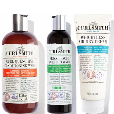 The Curlsmith Moisture and Frizz Control Bundle features three haircare essentials that work in harmony to nourish dry-feeling hair and add shape to your styles. Vegan. Set Contents: Curl Quenching Conditioning Wash 355ml This multi-purpose formula combines the benefits of a shampoo and a conditioner in one step. Working from scalp to ends, the co-wash gently removes impurities and build-up for touchably soft results, while softening curls and enhancing manageability. Weightless Air Dry Cream 237ml Powered by a blend of jojoba, babassu, murumuru butter and castor oil, Curlsmith’s leave-in conditioner hydrates the strands and defines the natural curl pattern. Its featherlight texture makes the formula suitable for all hair textures. Frizz Rescue Curl Retainer 238ml A non-sticky jelly with medium hold, designed to minimise the appearance of flyaways for up to 72 hours. Infused with a refreshing fruity citrus aroma, the styler utilises a blend of plant oils to form a protective coat over the hair, helping to reduce water absorption.