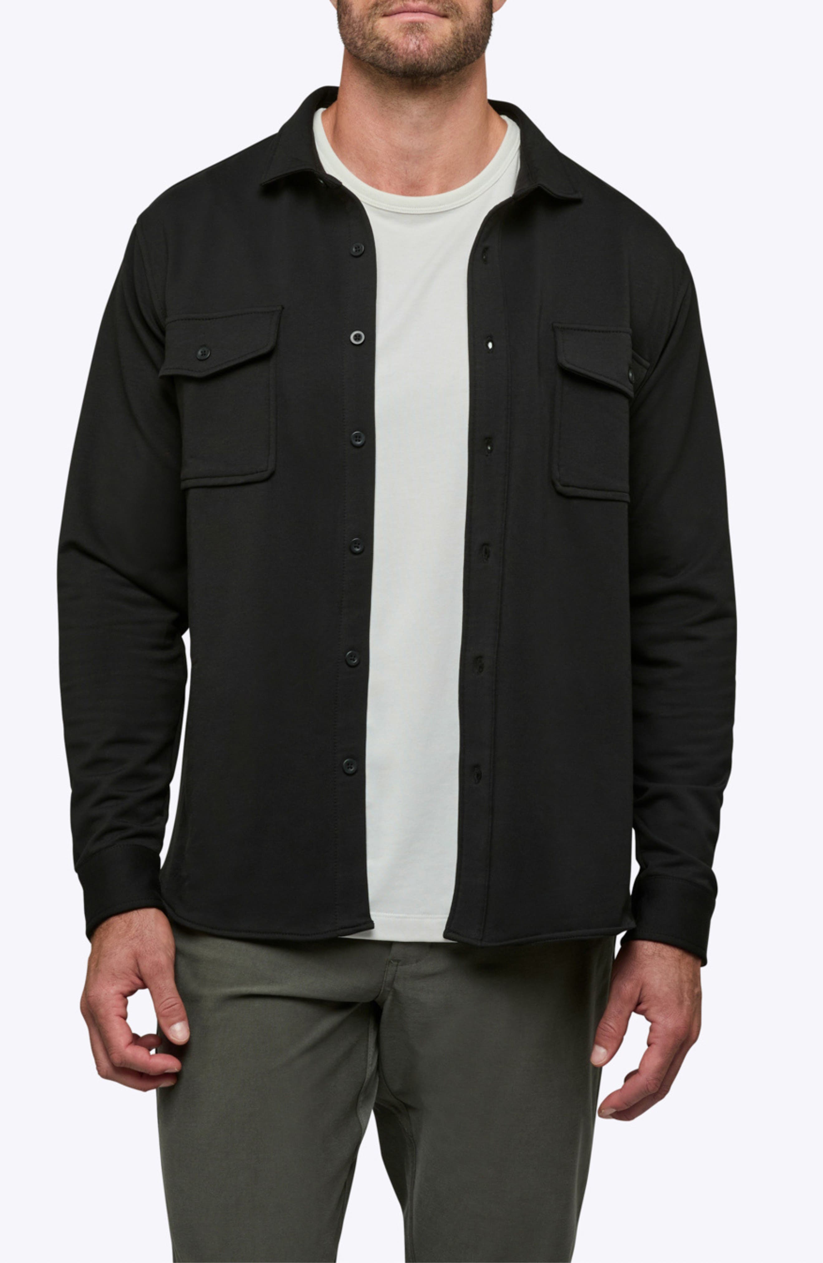 Cut from French terry fabric for the feel of a premium sweatshirt with the structure of a button-up, this essential overshirt is perfect for layering over base layers or under jackets. A tailored silhouette and tonal buttons keep the look refined. Front button closure Spread collar Long sleeves with two-button cuffs<br type="_moz"> Chest button-flap patch pockets 320 g/m² French terry fabric<br type="_moz"> Unlined 52% polyester, 42% cotton, 6% spandex Machine wash, tumble dry Imported
