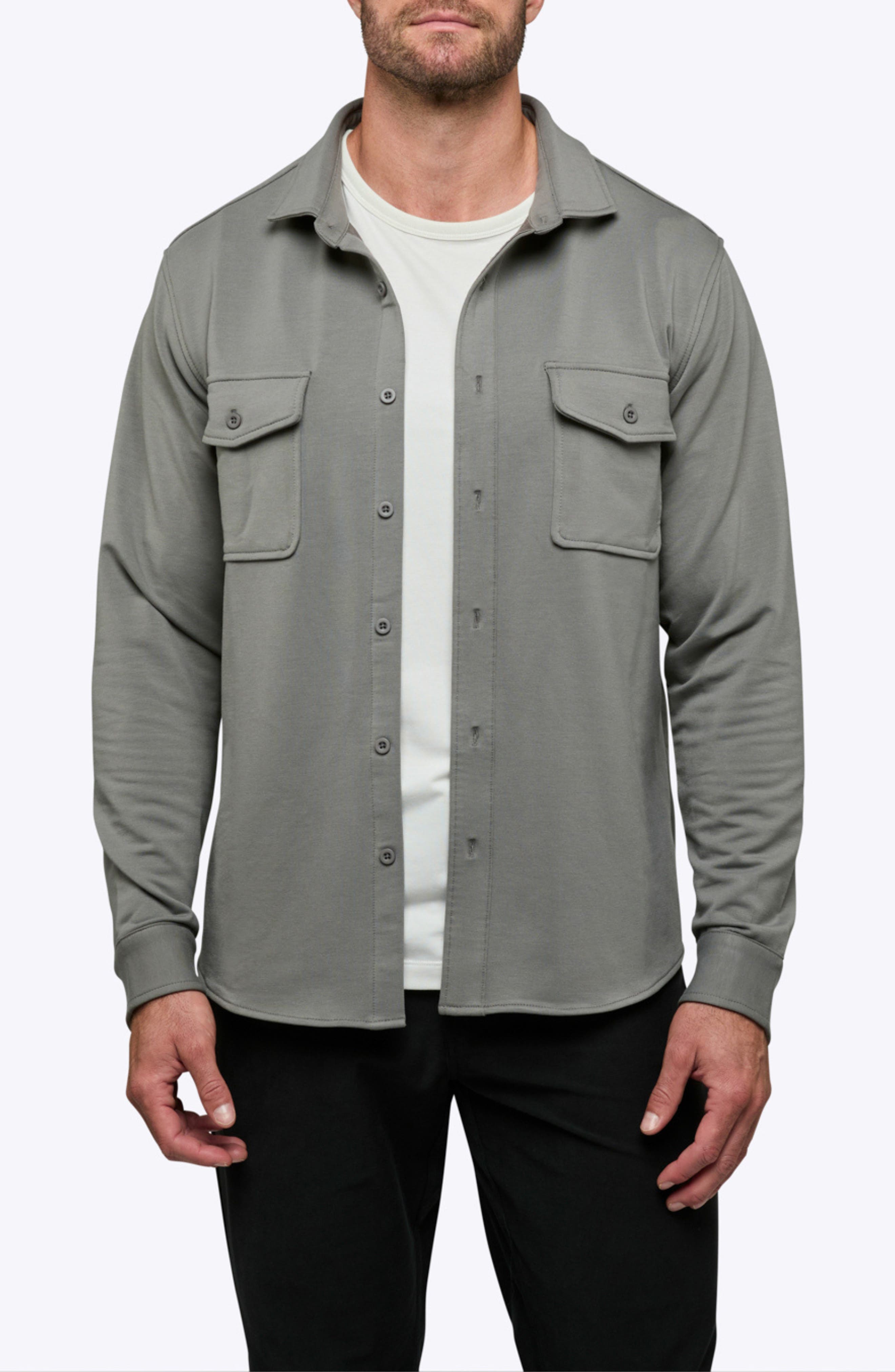 Cut from French terry fabric for the feel of a premium sweatshirt with the structure of a button-up, this essential overshirt is perfect for layering over base layers or under jackets. A tailored silhouette and tonal buttons keep the look refined. Front button closure Spread collar Long sleeves with two-button cuffs<br type="_moz"> Chest button-flap patch pockets 320 g/m² French terry fabric<br type="_moz"> Unlined 52% polyester, 42% cotton, 6% spandex Machine wash, tumble dry Imported