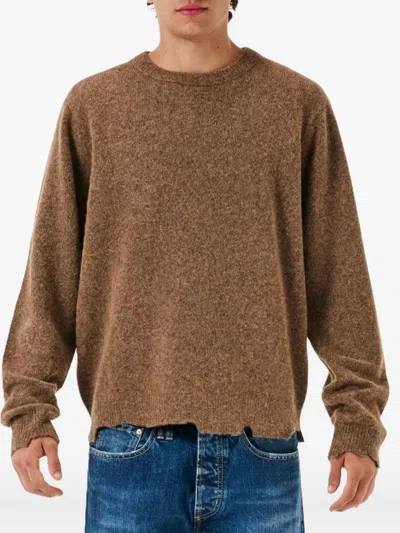brown frayed hem round neck long sleeves ribbed cuffs knit construction