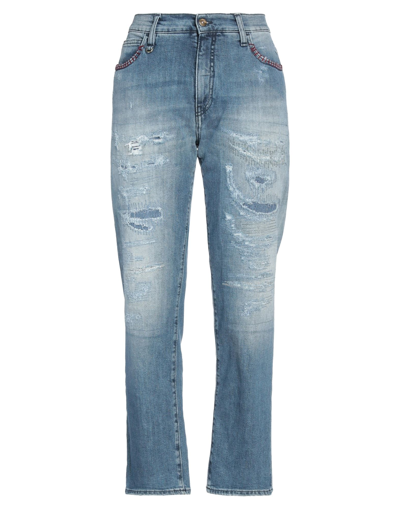 denim, faded, embroidered detailing, brand logo, worn effect, solid colour with appliqués, mid rise, medium wash, 1 button, zipper closure, five pockets, stretch, boyfriend model , Color: Blue , Size: 32