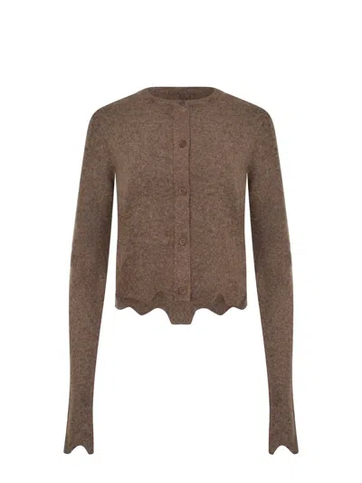 Cardigan Cycle made from a wool and alpaca blend in Hazelnut color. Crew neck. Long sleeves. Front button closure. Asymmetrical hem with a worn effect. Metal logo applied on the back.