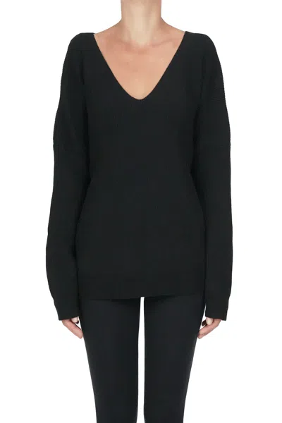 Ribbed knit pullover, boat neckline at front, back V-neckline. COMPOSITION: 70% Wool 20% Silk 10% Cashmere Made in Italy