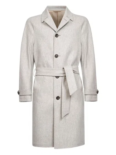 light beige notched collar five-button placket long raglan sleeves buttoned tab at cuffs detachable belt