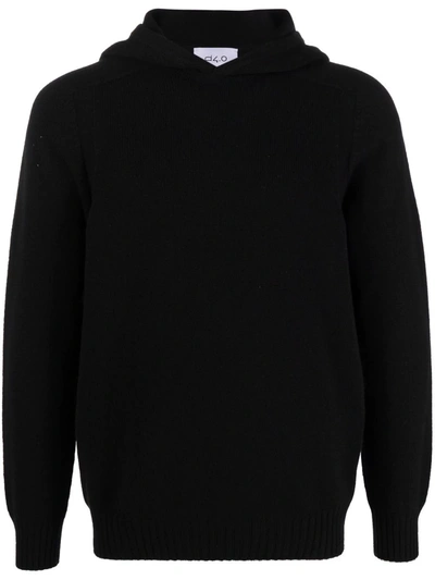 Jet-black virgin wool knitted pullover hoodie from D4.0 featuring fine knit, classic hood, long sleeves and ribbed hem.