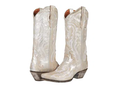 Dan Post Frost Bite - Women's Boots : Silver : Please click for Dan Post heel slip information. ; Please click for Dan Post Soft Strike Comfort System information. ; The Dan Post Frost Bite boots are perfect for every occasion and event! ; Metallic leather upper. ; Shaft features intricate Western floral stitching detail and tonal leather piping. ; Full leather lining for a comfortable fit and feel. ; Comfort cushion footbed provides incredible underfoot support. ; Snip toe. ; Medium cowboy heel. ; Floral-tooled leather outsole with a rubber heel cap for excellent traction. ; Imported. Measurements: ; Weight: 1 lb 4 oz ; Circumference: 12 1 2 in ; Shaft: 13 in ; Product measurements were taken using size 8, width B - Medium. Please note that measurements may vary by size. | Dan Post Frost Bite Women's Boots Silver : 8 B - Medium, Leather