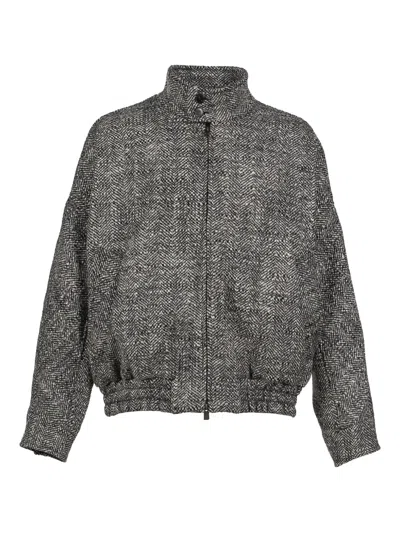 Lee Casual jacket in grey wool, high collar, zip closure, long sleeves, buttons sleeves, herringbone motif , elastic waist, 98% virgin wool, 2% polyester, Made in Italy, the models is 1. 91 and wears size L