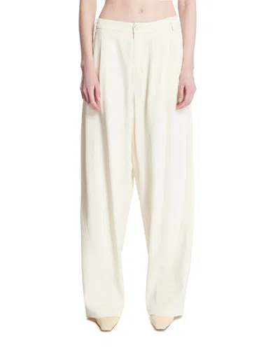 Darkpark White Phebe Pants. White viscose blend, low waist, belt loops, front button-and-zip closure, wide straight-leg design. Three pockets, loose fit. Yana is 178 cm and she is wearing size 38.