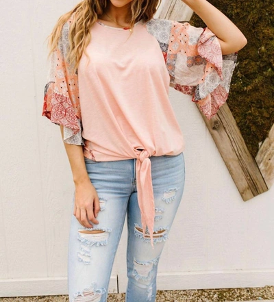 Pair this with your favorite jeans and slides for your next girls night out.This pretty peach-colored top combines peach knit on the front & a boho chic patchwork pattern on the back. The flowing ruffled half sleeves match the back, & the front features an adjustable tie at the hem. Lightweight Stretch Through Material Slightly Sheer Adjustable Tie Detail At Hem Oversized Fit *Measurements listed below are of the actual clothing item*XS - Chest 42" Length 28"Small - Chest 44" Length 28.5"Medium - Chest 46" Length 29"Large - Chest 48" Length 29.5"XL - Chest 50" Length 30"1XL - Chest 52" Length 30.5"2XL - Chest 54" Length 31"3XL - Chest 56" Length 31.5"Model Meg is 5' 6" and Wearing Size XS