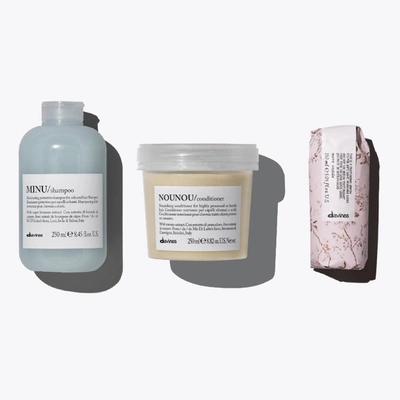 Haircare gift set for vibrant and nourished colored hair. A hair care gift set for vibrant and nourished colored hair The Nourished Color Hair Care Gift Set helps you bring your hair color to life. MINU Shampoo adds shine and keeps you color protected. NOUNOU Conditioner repairs any damage or dryness. This is a Texturizing Serum protects and adds body to the hair while styling. Together they keep colored hair healthy and vibrant. Davines The Nourished Color Set Haircare Gift Set For Vibrant & Nourished Colored Hair 3 pz