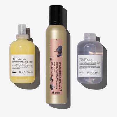 Volumizing hair products for adding the right volume. Volumizing hair products for adding the right volume The Soft Volume Set is a set of volumizing hair products that helps you get the right volume and natural-looking body for your hair. VOLU Shampoo gently cleanses for a boost of volume. DEDE Hair Mist lightly conditions for detangling and softness. This is a Volume Boosting Mousse adds airy volume with a light hold for long lasting styles. Davines The Soft Volume Set Volumizing Hair Products For Adding The Right Volume 3 pz