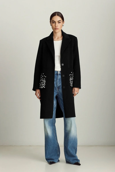 Color/Pattern: Black Approximately 41In From Shoulder To Hem Design Details: Vienna Double Faced Wool Coat With Hand-Sewn Crystal Embellishment On Pockets Button Front This Item Is Lined This Item Has A Built-In Bra 81% Wool, 16% Nylon, 3% Polyester 95% Polyester, 5% Spandex Dry Clean Only Imported