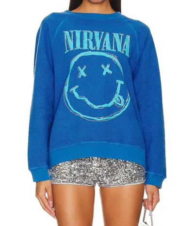 Nirvana Smiley Reverse Raglan Crew In Washed Cobalt In Multi