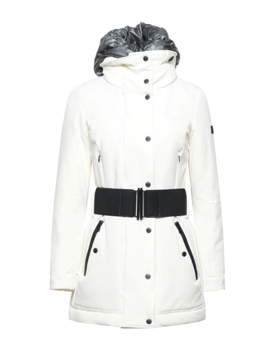 techno fabric, brand logo, belt, two-tone, neckline with removable hood, single-breasted , long sleeves, duck down filling, multipockets, stretch, contains non-textile parts of animal origin, small sized, snap buttons fastening, zipper closure, pocket with zipper , Color: Ivory , Size: 6