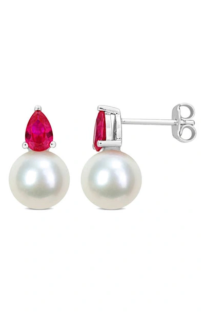 DELMAR Lab Created Ruby & Freshwater Pearl Stud Earrings In Red