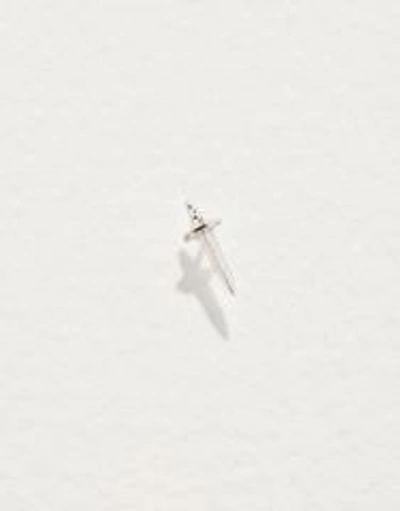 A delicate, mini version of our iconic dagger motif. Sold as a single. SIZE & MATERIALS Composition: 14k white gold Measurements: dagger: 5.5mm, threaded back post thickness: 19 gauge ( 0.95mm), post length: 6.5mm Closure: internally threaded heart back Read about piercing jewelry and closure systems Collections White Gold Jewelry - Dagger Earrings - Gold Piercings - White Gold Piercing