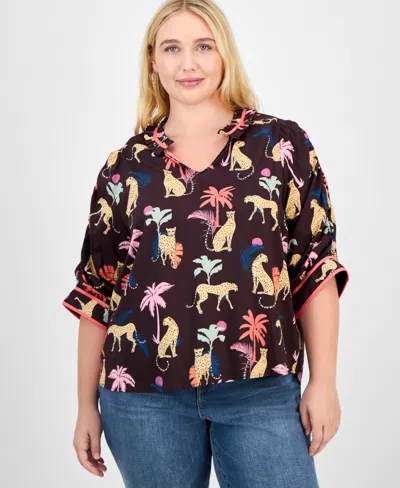 DEMOCRACY Trendy Plus Printed Split-neck Flutter-sleeve Top In Multi
