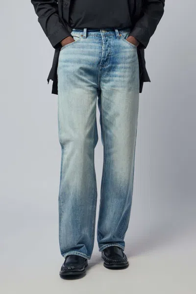 Wide-leg jeans featuring a classic medium wash, designed for a relaxed fit and casual style. The jeans include traditional details and a comfortable silhouette for everyday wear. Wide-leg cut Medium blue wash Classic five-pocket style Button and zip closure Belt loops Contrast stitching Copper rivets