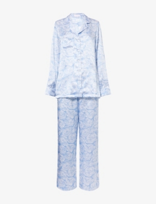 Womens Blue Rose-print Silk Pyjamas