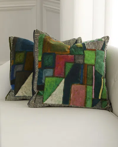 Inspired by the beauty of raku glazes, this contemporary graphic decorative pillow features contrasting geometric shapes and forms in textured emerald green and colorful shades. The design is digitally printed onto luxurious velvet, which reverses to solid velvet on the back. It's trimmed on two sides with Calozzo Graphite. Crafted of cotton, viscose, and polyester Duck feather insert Approx. 20"Sq. Item Weight (Lbs.): 1.4 Dry clean Imported