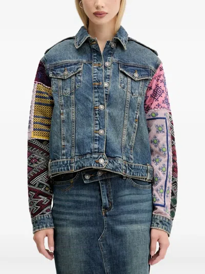 blue and multicolour patchwork design button fastening chest pockets long sleeves