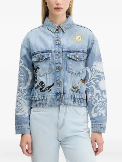 light blue floral embroidery button fastening front flap pockets long sleeves elasticated hem