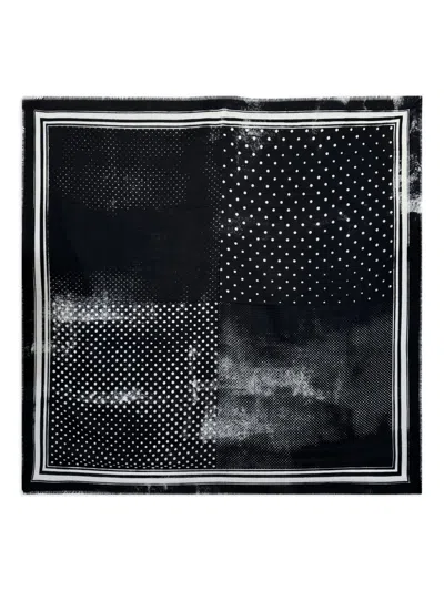 <div><ul><li>black</li><li>polka dot pattern</li><li>stripe detail</li><li>frayed edges</li><li>square shape</li><li>panelled design</li></ul></div>
