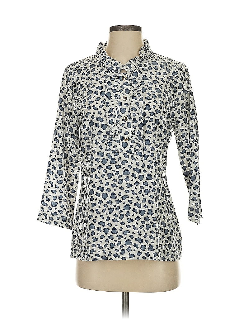 Devon Baer 3/4 Sleeve Button Down Shirt, Size: Small. Item Details: Ivory, Animal Print Pattern, Tie Neck, Women's Tops